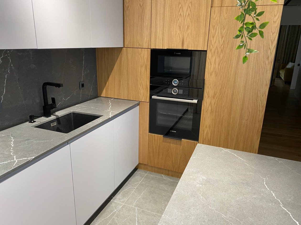 Кварцевый камень Antracite (Антрацит) от SmartQuartz — декор с направленными молниеобразными белыми жилками на насыщенном антрацитовом фоне производит потрясающий эффект. Цвет сезона!